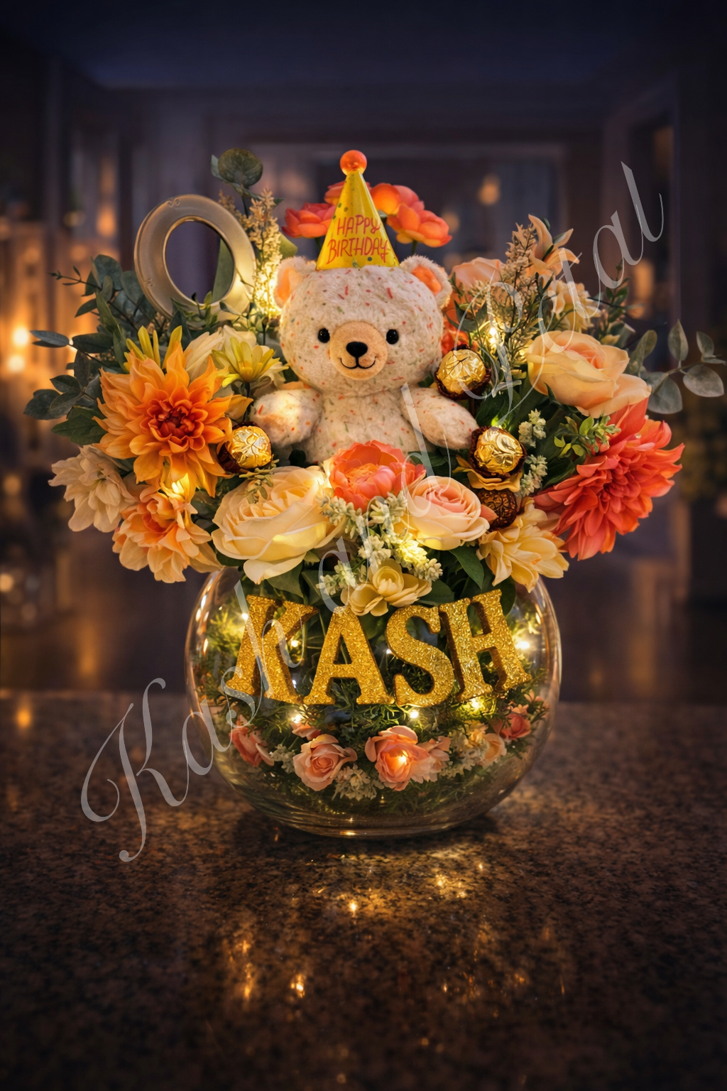 Designed in a full, illuminated glass vessel, this premium arrangement includes fuller enhanced florals, a plush keepsake, and our most-loved custom details — thoughtfully combined into one unforgettable piece.